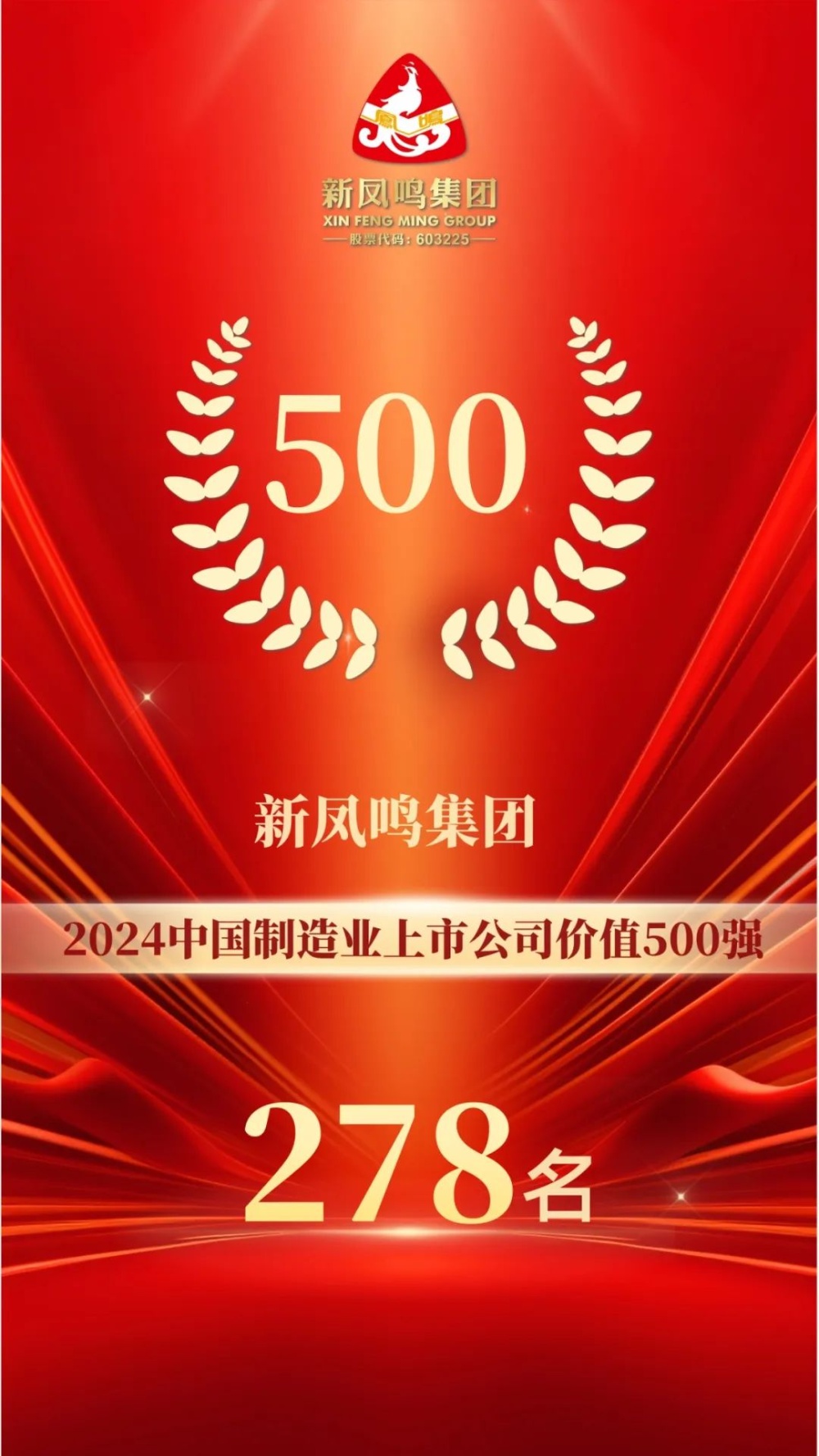 克日,,,,,,,第九届中国制造业上市公司价值500强盛会暨数字CEO圆桌论坛在北京盛大召开。。。。。大会宣布2024中国制造业上市公司价值500强榜单,,,,,,,摩登4-梦想照进现实,努力成就未来!股份(603225.SH)位列榜单第278名。。。。。