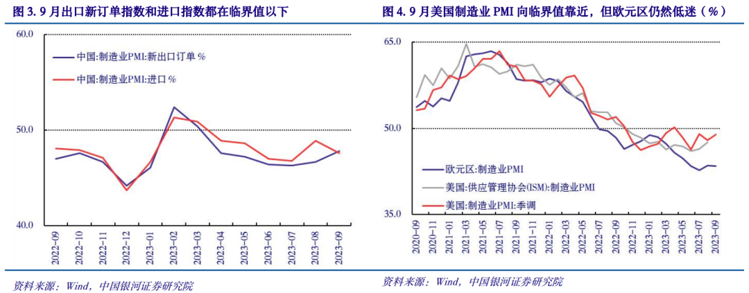 9月制造业新订单指数、生产指数都有进一步加速,,,,,,,,供需同时扩张。。。。。。。。9月生产指数升至52.7%(前值51.9%),,,,,,,,新订单恢复至50.5%(前值50.2%),,,,,,,,供应与需求同步恢复。。。。。。。。但新出口订单指数和入口指数小幅回升但仍在临界值以下,,,,,,,,划分为47.8%和47.6%(前值46.7%和48.9%),,,,,,,,出口预期有一定修复,,,,,,,,但入口预期回落。。。。。。。。展望下一阶段,,,,,,,,目今美国制造业PMI已经最先企稳并向临界值回归,,,,,,,,未来美联储完全阻止加息(预计2023Q4)之后,,,,,,,,可能对中国出口会有进一步增进作用。。。。。。。。