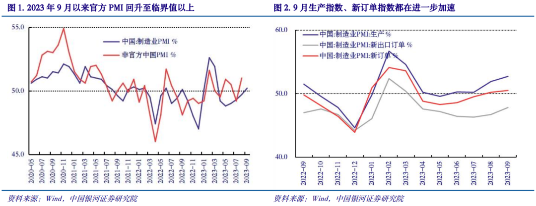 剖析:9月制造业PMI终于回归光临界值以上,,,,,,,,其中生产指数和新订单指数都进一步扩张,,,,,,,,出厂价和购进价也都在继续上行,,,,,,,,但新出口订单与入口指数、库存指数、中小企业与从业职员指数仍然在缩短。。。。。。。。效劳业PMI竣事了3月以来一连下行的趋势,,,,,,,,但效劳业新订单指数还在进一步缩短。。。。。。。。修建业PMI加速,,,,,,,,其中修建业新订单指数回升至50.0%。。。。。。。。总之,,,,,,,,经济已最先修复但斜率仍相对缺乏,,,,,,,,2023Q4起点优异,,,,,,,,下一阶段应应期待政策组合的进一步效果和美联储最终阻止加息之后的出口见底。。。。。。。。